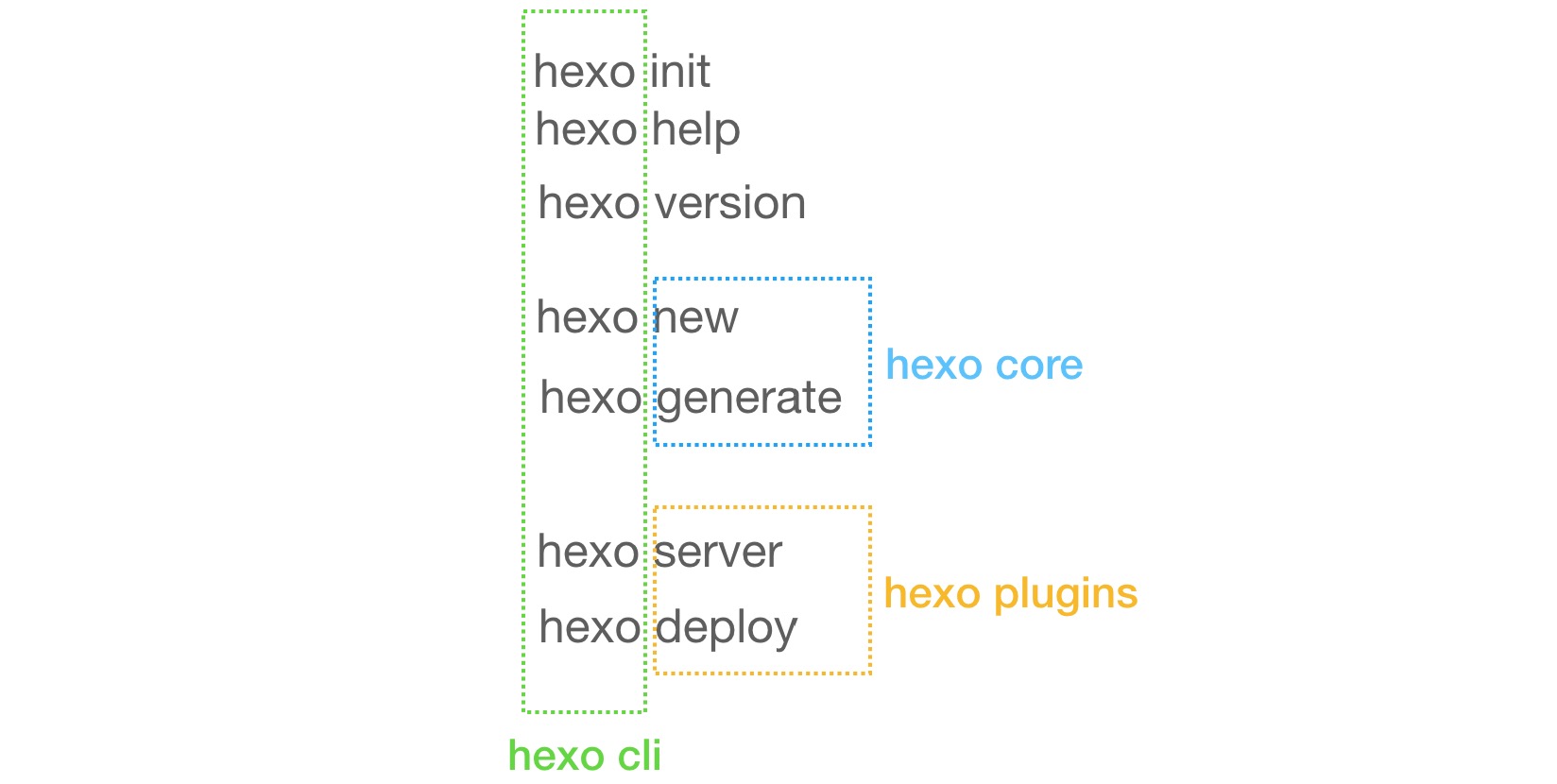 hexo和webpack还有一点类似的地方就是插件驱动理念。即hexo(和webpack)是先实现一套(插件)扩展系统,然后再往扩展系统中添加插件来实现自身的功能。即我们日常使用的hexo init, hexo new,hexo generate等等功能都是通过一个个插件(其实就是一个个function)实现的。